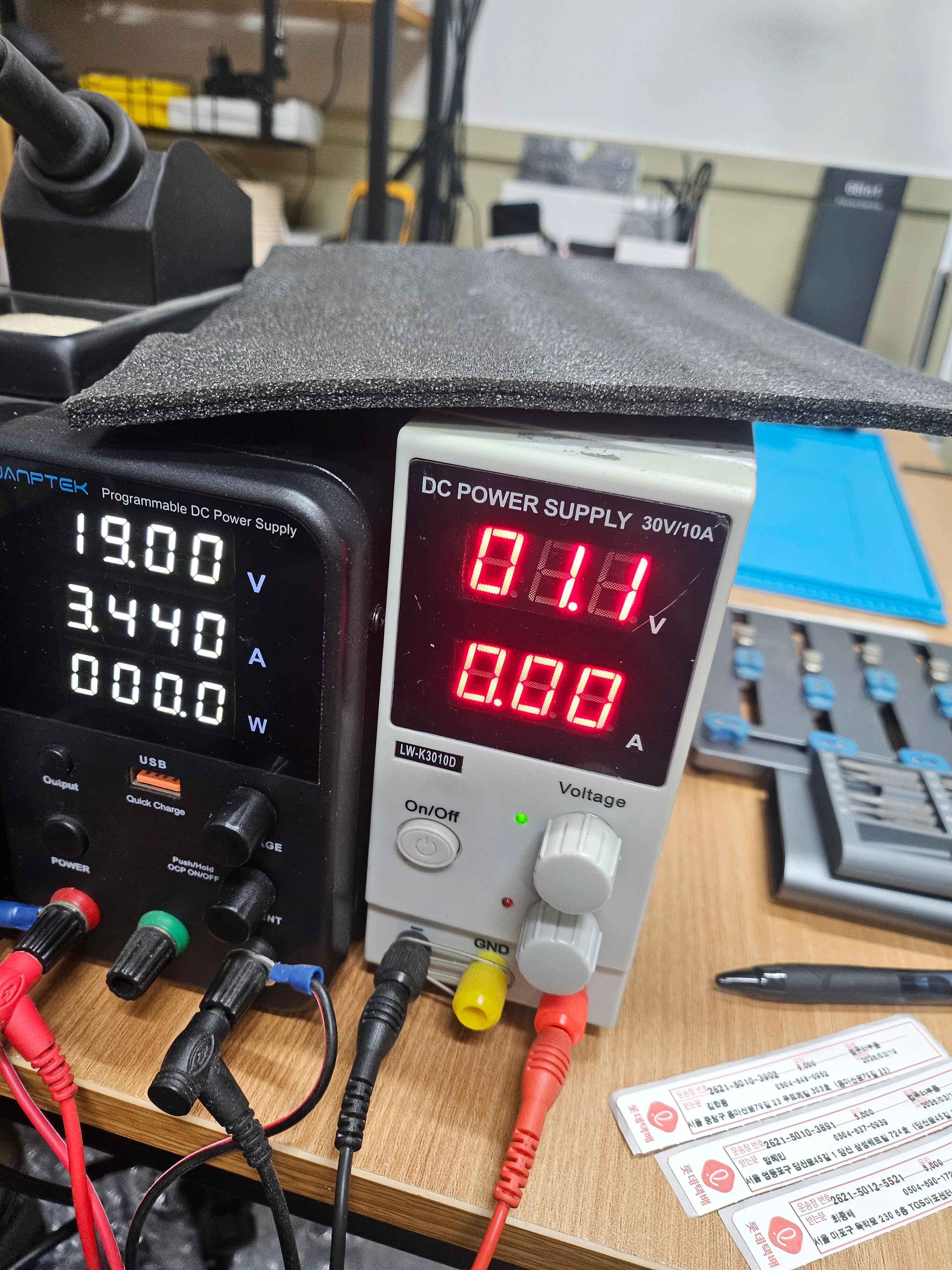 DC파워서플라이를 통해 19V 인가했을때 전류값이 급격히 상승하거나 전압이 강하되는 현상을 확인 했습니다.