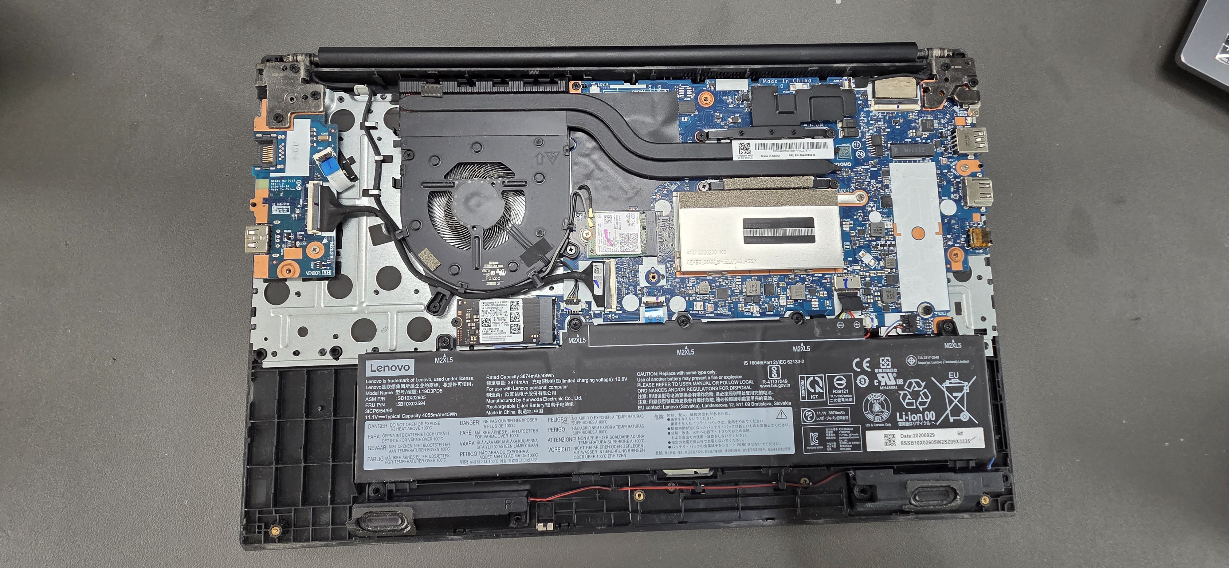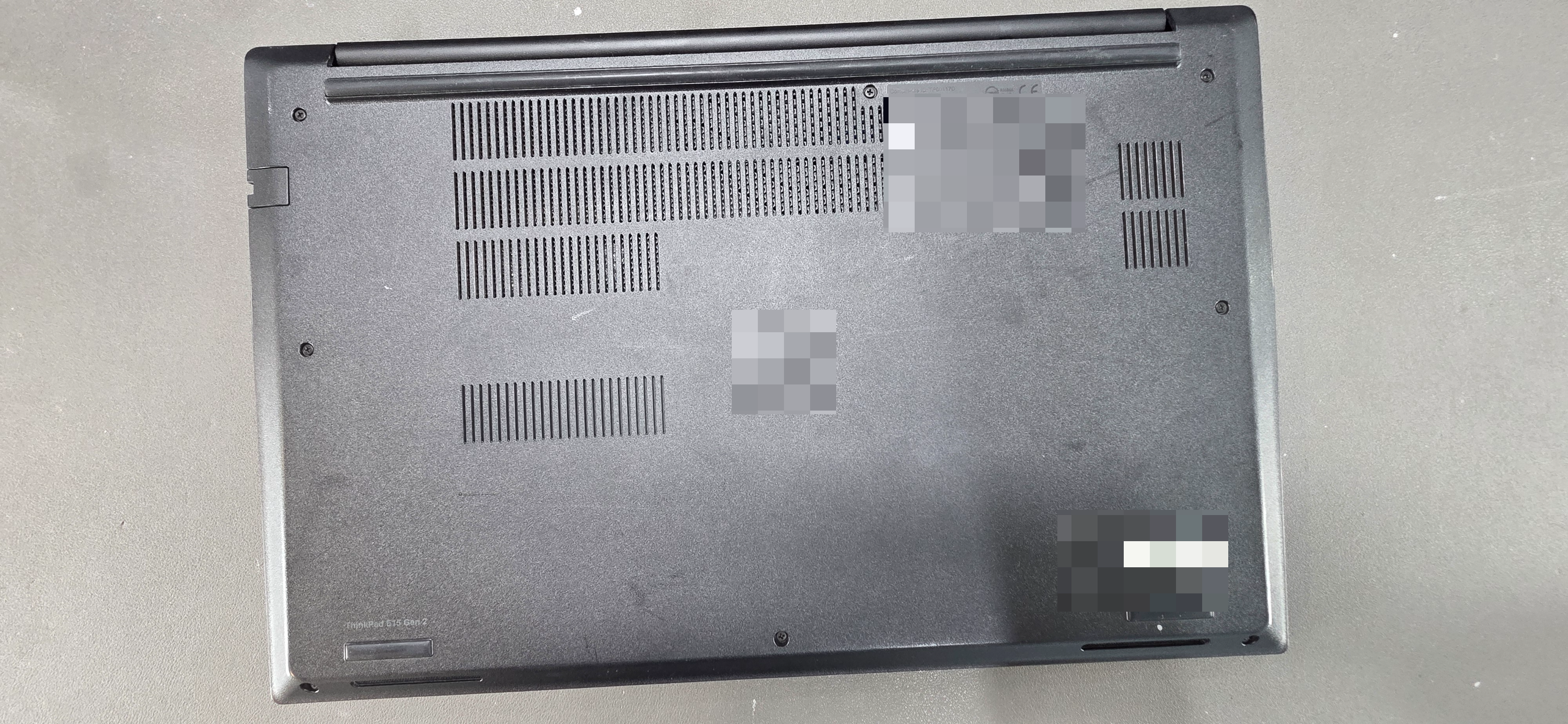 수리를 위해 하판 나사를 풀고 내부를 점검해 봅니다. 씽크패드 E15 Gen 2는 내부 구조가 비교적 직관적이지만, 키보드 케이블은 메인보드 아래쪽 혹은 팜레스트 안쪽에 깊숙이 자리 잡고 있어 주의가 필요합니다.