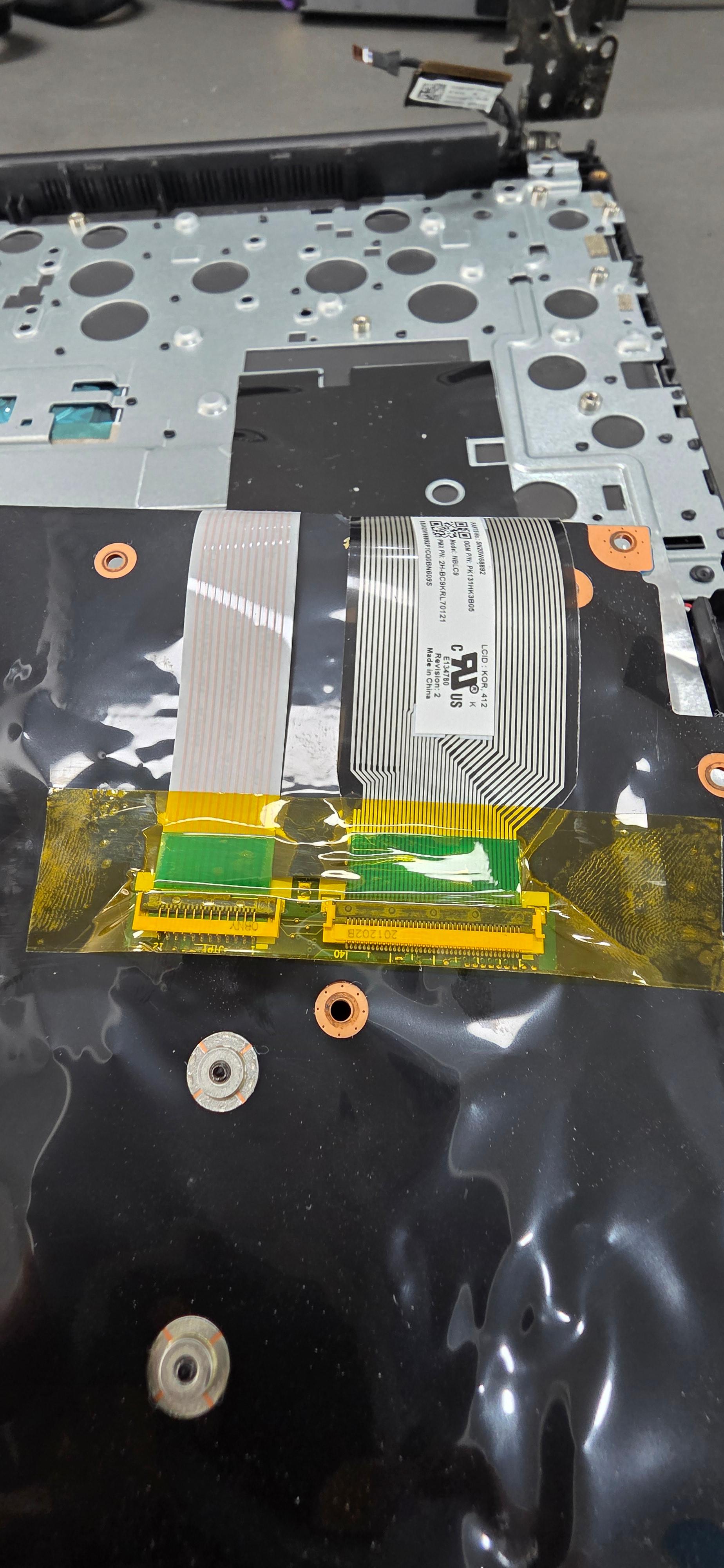 노란색 반투명 캡톤 테이프를 사용해 커넥터와 케이블 연결 부위를 강력하게 고정했습니다. 캡톤 테이프는 내열성이 뛰어나고 절연 성능이 좋아 노트북 내부 수리에 필수적인 자재입니다.