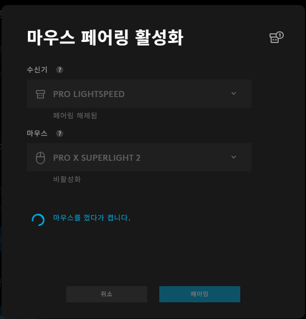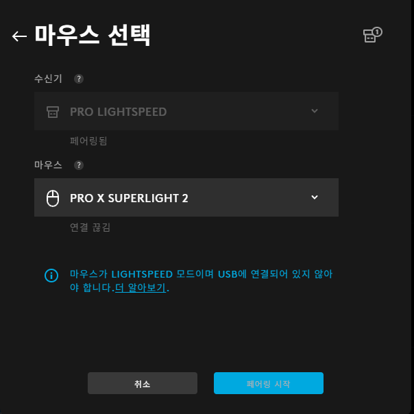 PRO LIGHTSPEED선택---->계속---->PRO X SUPERLIGHT2 선택---->페어링 시작